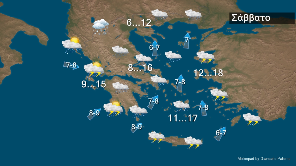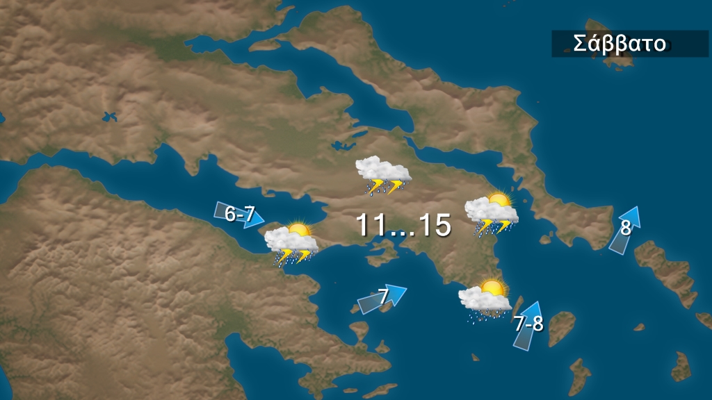 Το Σάββατο θα επικρατήσει κακοκαιρία σχεδόν σε όλη τη χώρα με κύρια χαρακτηριστικά, τις ισχυρές βροχές και καταιγίδες, οι οποίες θα συνοδεύονται από χαλαζοπτώσεις και πολύ θυελλώδεις ανέμους. Τα φαινόμενα θα εξασθενήσουν, από το μεσημέρι στα δυτικά, από το απόγευμα σταδιακά στα ανατολικά ηπειρωτικά, τις Κυκλάδες και την Κρήτη και από τη νύχτα βαθμιαία στα νησιά του ανατολικού Αιγαίου και τα Δωδεκάνησα.