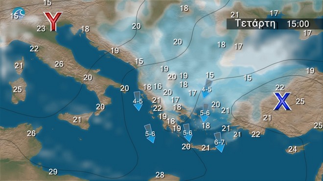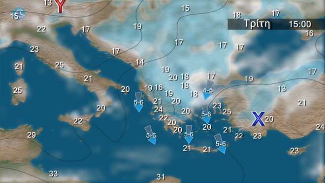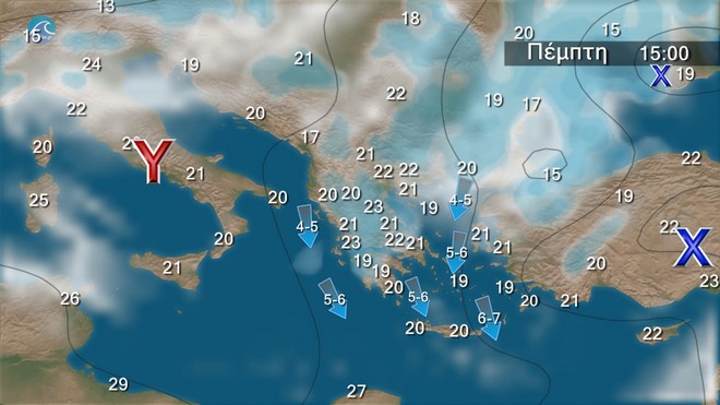 Αρχικά στη Μακεδονία και τη Θράκη και βαθμιαία στα υπόλοιπα ηπειρωτικά και το βόρειο Αιγαίο νεφώσεις παροδικά αυξημένες με τοπικές βροχές και σποραδικές καταιγίδες κυρίως τις μεσημβρινές και απογευματινές ώρες. Στις υπόλοιπες περιοχές αραιές νεφώσεις που βαθμιαία θα πυκνώσουν. Οι άνεμοι θα πνέουν από βόρειες διευθύνσεις 3 με 5, και από το απόγευμα στο βόρειο Ιόνιο 6 μποφόρ. Η θερμοκρασία δεν θα σημειώσει αξιόλογη μεταβολή.
