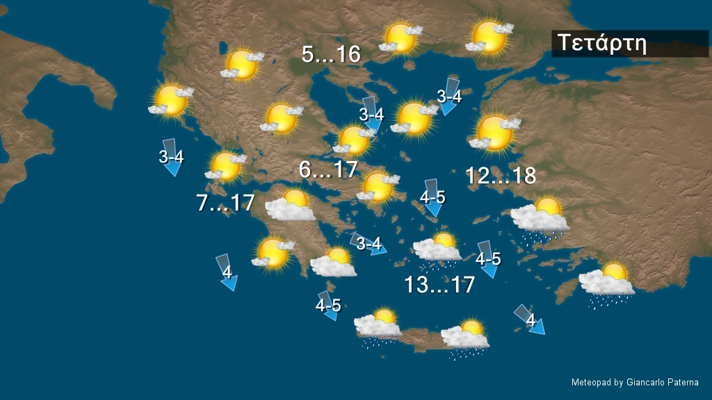 Για την Τετάρτη προβλέπονται λίγες νεφώσεις παροδικά αυξημένες κυρίως στα ανατολικά και τα νότια, όπου θα σημειωθούν τοπικές βροχές.