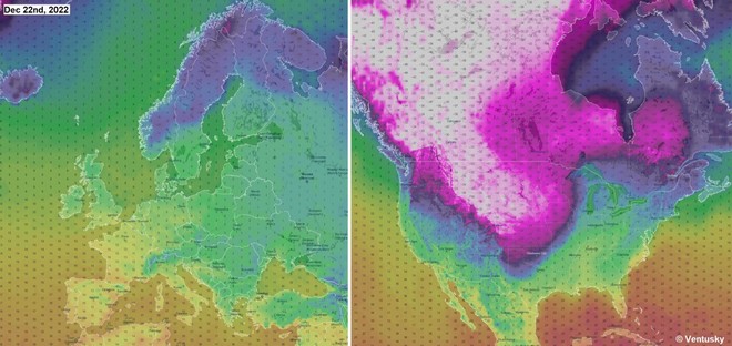 Εντυπωσιακή διαφορά στις θερμοκρασίες παρατηρείται μεταξύ Ευρώπης και της Βόρειας Αμερικής από σήμερα 22 Δεκεμβρίου 2022. H Ευρώπη έχει και θα έχει ήπιο καιρό, ενώ αντίθετα ο Καναδάς και οι ΗΠΑ προβλέπεται να βιώσουν μια ιστορική ψυχρή εισβολή που έρχεται από την Αρκτική.