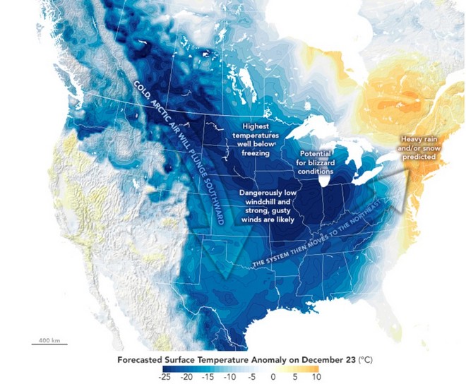 «Το αρχικό κύμα παγωμένου αέρα θα βυθιστεί γρήγορα νότια από τον Καναδά στο Τέξας στις 22 προς 23 Δεκεμβρίου και θα πυροδοτήσει ένα εντυπωσιακό χειμερινό σύστημα κατά μήκος των ορίων του, με πολύ θερμότερο και υγρότερο αέρα να ρέει βόρεια από τον Κόλπο του Μεξικού», εξήγησε ο Gary Partyka, ατμοσφαιρικός επιστήμονας. με το Global Modeling and Assimilation Office στο Goddard Space Flight Center της NASA.