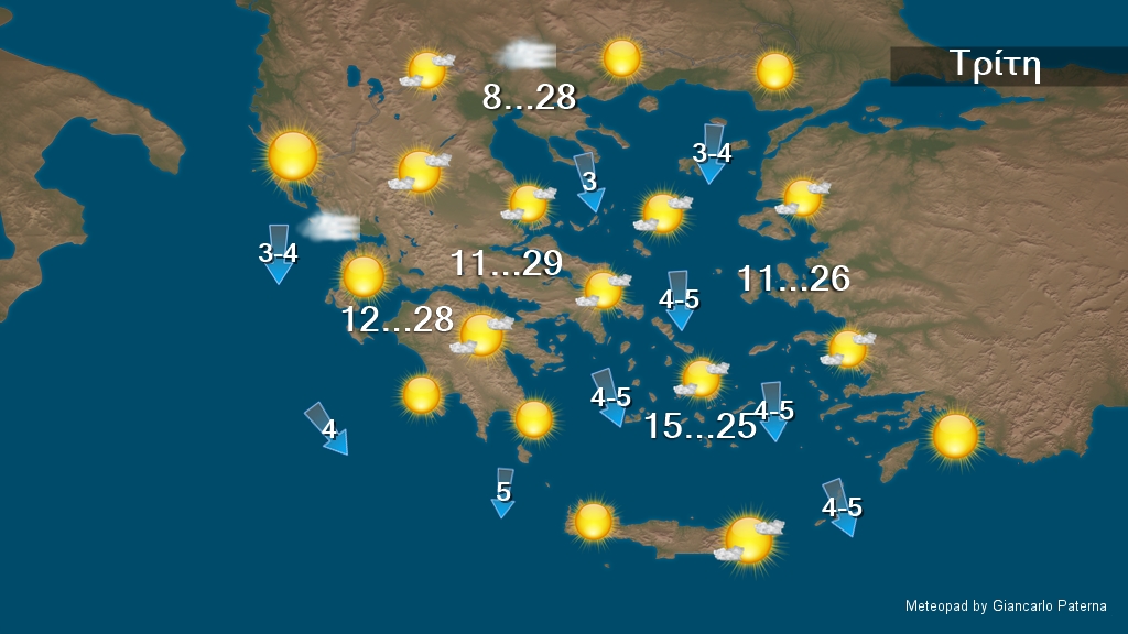 Γενικά αίθριος καιρός. Λίγες νεφώσεις στα βορειοανατολικά. Η ορατότητα τις πρωινές και βραδινές ώρες θα είναι τοπικά περιορισμένη και θα σχηματιστούν κατά τόπους ομίχλες. Οι άνεμοι θα πνέουν από βόρειες διευθύνσεις 3 με 4, στα πελάγη τοπικά 5 και στο Ιόνιο έως 6 μποφόρ. Η θερμοκρασία δεν θα σημειώσει αξιόλογη μεταβολή. Θα φθάσει τους 25 με 26 και κατά τόπους στα ηπειρωτικά τους 27 με 28 βαθμούς Κελσίου.