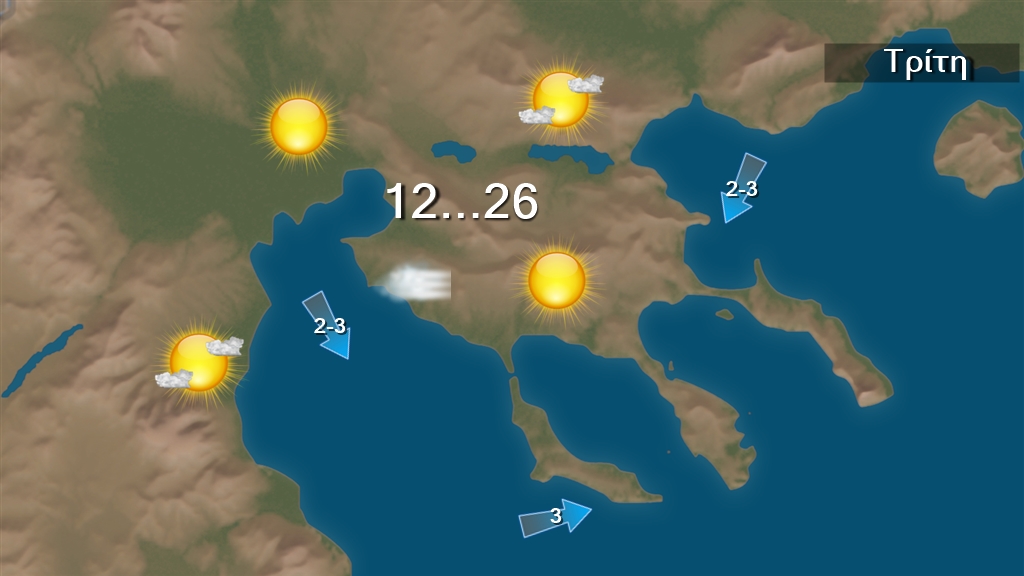 Σήμερα Τρίτη προβλέπεται γενικά αίθριος καιρός, με πρόσκαιρες τοπικές νεφώσεις στα δυτικά και τα βόρεια. Η ορατότητα τις πρωινές και βραδινές ώρες θα είναι τοπικά περιορισμένη κυρίως στα δυτικά και τα βόρεια και θα σχηματιστούν κατά τόπους ομίχλες. Οι άνεμοι στο Αιγαίο θα πνέουν από βόρειες διευθύνσεις 3 με 5 μποφόρ.