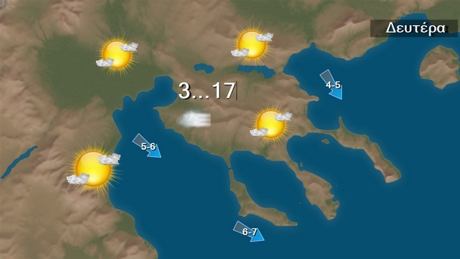 Τη Δευτέρα προβλέπεται γενικά αίθριος καιρός με πρόσκαιρες τοπικές νεφώσεις στα δυτικά και την ανατολική και νότια νησιωτική χώρα, με πιθανότητα ασθενών τοπικών βροχών στα ανατολικά. Η ορατότητα τις πρωινές και βραδινές ώρες, κυρίως στα δυτικά ηπειρωτικά, θα είναι τοπικά περιορισμένη και πιθανόν να σχηματιστούν και ομίχλες. Οι άνεμοι θα είναι αρχικά δυτικοί βορειοδυτικοί 4 με 6 και στο Αιγαίο τοπικά 7 μποφόρ και μόνο στα ανατολικά τις πρωινές ώρες θα πνέουν από νότιες διευθύνσεις. Βαθμιαία θα στραφούν σε βόρειους βορειοδυτικούς και σταδιακά από το απόγευμα θα εξασθενήσουν.