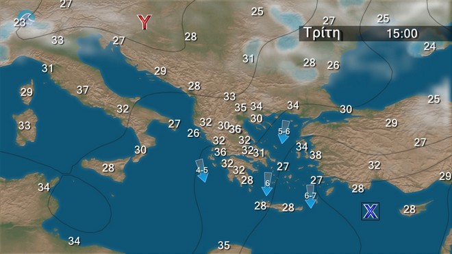 Γενικά αίθριος καιρός. Τις μεσημβρινές και απογευματινές ώρες στα ηπειρωτικά θα αναπτυχθούν πρόσκαιρες νεφώσεις και θα εκδηλωθούν τοπικοί όμβροι στα βόρεια ορεινά. Οι άνεμοι θα πνέουν από βόρειες διευθύνσεις 4 με 6 και στο Αιγαίο τοπικά 7 μποφόρ. Η θερμοκρασία σε μικρή άνοδο, στα ηπειρωτικά θα φτάσει κατά τόπους τους 34 με 35 βαθμούς Κελσίου.