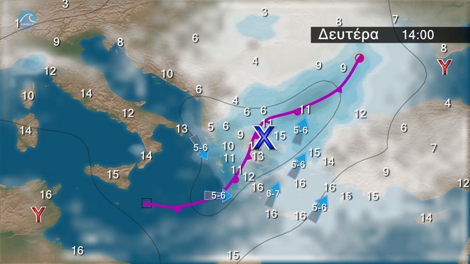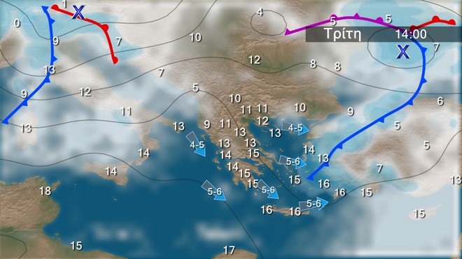 Οι άνεμοι θα πνέουν στα δυτικά νοτιοδυτικοί 4 με 6, στρεφόμενοι γρήγορα σε βορειοδυτικούς με την ίδια ένταση. Στα ανατολικά θα πνέουν νοτιοδυτικοί 5 με 6 και στο Αιγαίο 7 μποφόρ, στρεφόμενοι από το απόγευμα και από τα βόρεια, σε δυτικούς βορειοδυτικούς 4 με 6 μποφόρ.