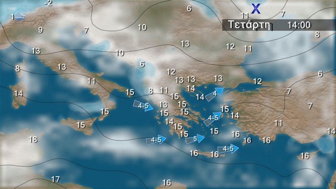 Οι άνεμοι θα πνέουν στα δυτικά νότιοι 5 με 6 και στο Ιόνιο τοπικά 7 μποφόρ και στα υπόλοιπα νοτιοδυτικοί 4 με 6 και το βράδυ στο Αιγαίο έως 7 μποφόρ.