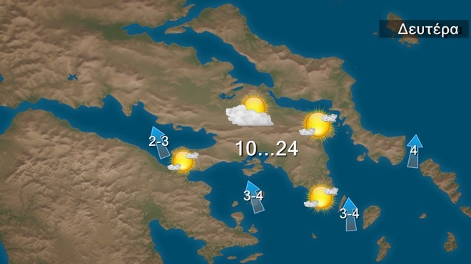 Σήμερα Δευτέρα αρχικά προβλέπεται γενικά αίθριος καιρός με λίγες τοπικές νεφώσεις, οι οποίες στα ηπειρωτικά τις μεσημβρινές και απογευματινές ώρες θα αυξηθούν και θα εκδηλωθούν τοπικοί όμβροι ή μεμονωμένες καταιγίδες κυρίως στα κεντρικά και βόρεια ορεινά. Η ορατότητα τις πρωινές και τις βραδινές ώρες θα είναι τοπικά περιορισμένη και είναι πιθανό να σχηματιστούν ομίχλες. Οι άνεμοι θα πνέουν μεταβλητοί ασθενείς και τοπικά στα πελάγη έως 4 με 5 μποφόρ. Η θερμοκρασία δεν θα σημειώσει αξιόλογη μεταβολή και θα κυμανθεί σε κανονικά για την εποχή επίπεδα και θα φτάσει στα ηπειρωτικά και το Ιόνιο τους 25 βαθμούς και στο Αιγαίο τους 21 με 22 βαθμούς Κελσίου.