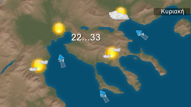 Για σήμερα Κυριακή προβλέπεται γενικά αίθριος καιρός με λίγες νεφώσεις στα βόρεια . Οι άνεμοι στο Αιγαίο, αλλά κατά τόπους και στα ανατολικά και νότια ηπειρωτικά θα πνέουν βόρειοι βορειοανατολικοί 6 με 7 μποφόρ και στο Ιόνιο 4 με 5 μποφόρ.Η θερμοκρασία θα κυμαίνεται σε κανονικά επίπεδα για την εποχή με μέγιστη τιμή στα ηπειρωτικά τους 35 με 36 βαθμούς και στα δυτικά τους 37 και στγα νησιά του Αιγαίου τους 30 με 34 βαθμούς .