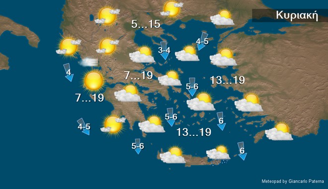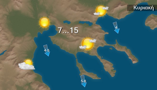 Οι άνεμοι θα πνέουν από βόρειες διευθύνσεις 4 με 5 και τοπικά στο Αιγαίο 6 μποφόρ. Στα δυτικά, τα κεντρικά και τα βόρεια οι άνεμοι γρήγορα θα εξασθενήσουν και από το απόγευμα θα πνέουν μεταβλητοί ασθενείς. Η θερμοκρασία θα παρουσιάσει μικρή πτώση στα βόρεια, όπου δεν θα ξεπεράσει τους 15 βαθμούς, ενώ στις υπόλοιπες περιοχές θα φθάσει τους 17 με 19 βαθμούς Κελσίου θερμοκρασίες υψηλές για την εποχή.