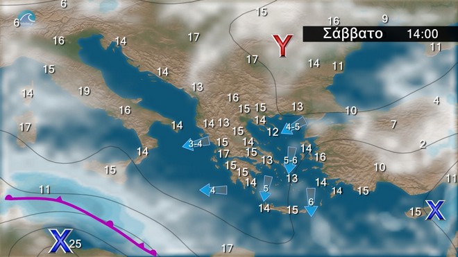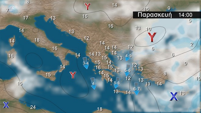 Στα ανατολικά και τα νότια λίγες νεφώσεις παροδικά αυξημένες, με ασθενείς τοπικές βροχές στην Κρήτη. Στην υπόλοιπη χώρα γενικά αίθριος καιρός. Οι άνεμοι θα πνέουν από βόρειες διευθύνσεις, στα δυτικά ασθενείς, στα ανατολικά 4 με 5 και στο Αιγαίο 6 τοπικά 7 μποφόρ με σταδιακή εξασθένηση. Η θερμοκρασία θα σημειώσει άνοδο στο Ιόνιο και τα ηπειρωτικά, ως προς τις μέγιστες τιμές.