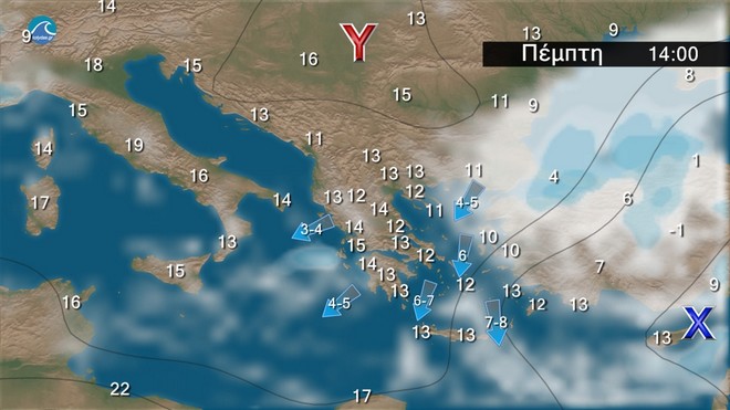 Λίγες νεφώσεις κατά τόπους αυξημένες, με τοπικές βροχές στα νησιά του Ιονίου, την Πελοπόννησο και πρόσκαιρα στην Εύβοια, την ανατολική Στερεά και την Κρήτη και λίγα χιόνια στα ηπειρωτικά ορεινά. Οι άνεμοι θα πνέουν στα δυτικά από ανατολικές διευθύνσεις 4 με 6 μποφόρ με βαθμιαία εξασθένηση από το απόγευμα. Στα ανατολικά βόρειοι βορειοανατολικοί 5 με 7 και στο Αιγαίο τοπικά 8 μποφόρ, με μικρή εξασθένηση από το απόγευμα. Η θερμοκρασία θα σημειώσει πτώση.