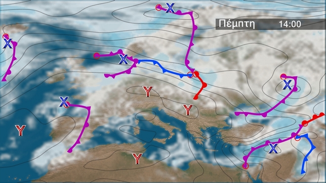 Με τοπικές νεφώσεις αλλά πολύ παγωνιά θα κυλήσει ο καιρός την Πέμπτη σε μεγάλο μέρος της χώρας με λίγες βροχές ή χιονόνερο στην Κρήτη και παροδικές χιονοπτώσεις που βαθμιαία θα σταματήσουν. Στον χάρτη των βαρομετρικών συστημάτων της Ευρώπης παρατηρούμε ότι δεν υπάρχει κάποιο σημαντικό σύστημα να μας επηρεάζει, αντίθετα προς την περιοχή μας επεκτείνονται ανατολικότερα οι ψηλές πιέσεις που επικρατούν στην Κεντρική Μεσόγειο και την Κεντρική Ευρώπη.