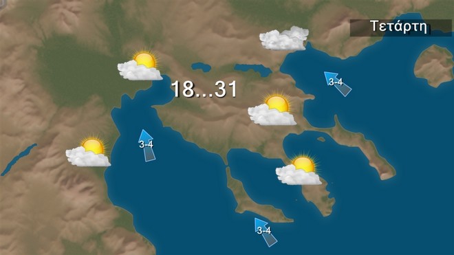 Σήμερα Τετάρτη προβλέπονται αραιές νεφώσεις κατά περιόδους αυξημένες στα κεντρικά και τα βόρεια όπου υπάρχει ενδεχόμενο όμβρων αστάθειας στα βόρεια ορεινά. Οι συγκεντρώσεις αφρικανικής σκόνης στην ατμόσφαιρα θα περιοριστούν στα ανατολικά. Οι άνεμοι θα πνέουν στα δυτικά και τα νότια αρχικά από νότιες διευθύνσεις 3 με 4 μποφόρ, στρεφόμενοι βαθμιαία σε δυτικούς, στα νότια πελάγη έως 6 μποφόρ. Στην υπόλοιπη χώρα θα πνέουν ασθενείς, βαθμιαία νότιοι έως 5 μποφόρ. Η θερμοκρασία θα σημειώσει μικρή πτώση κυρίως στα δυτικά και θα έχει μέγιστη τιμή στα βόρεια τους 30 βαθμούς στα υπόλοιπα ηπειρωτικά και το Ιόνιο τους 33 με 34 και στα νησιά του Αιγαίου τους 30 με 34 βαθμούς και τοπικά στην Κρήτη 35 βαθμούς Κελσίου.