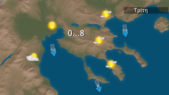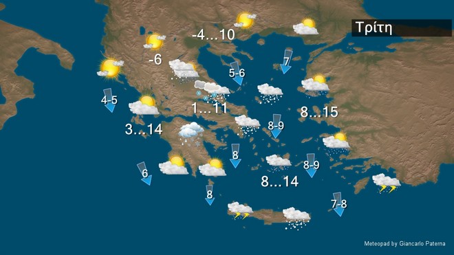 Την Τρίτη στα ανατολικά και τα νότια προβλέπονται τοπικές βροχές ή χιονόνερο και στην Κρήτη και τα Δωδεκάνησα σποραδικές καταιγίδες. Χιονοπτώσεις θα σημειωθούν στα ορεινά και τις πρωινές ώρες στα ημιορεινά της ανατολικής Στερεάς και της Εύβοιας. Βαθμιαία τα φαινόμενα θα περιοριστούν στα νότια και θα εξασθενήσουν.