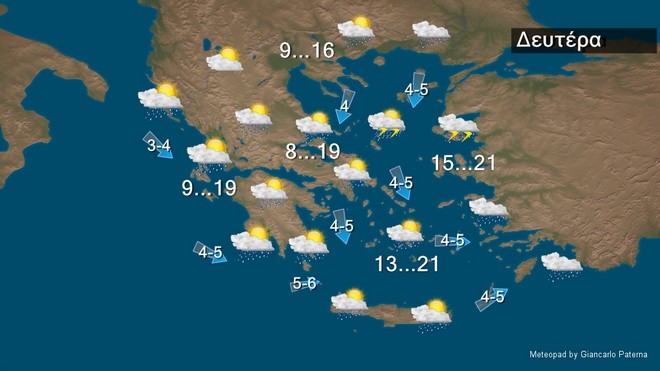 Οι άνεμοι δεν θα ξεπερνούν στα πελάγη τα 6 μποφόρ και η θερμοκρασία δεν θα αλλάξει σημαντικά. Έτσι ο υδράργυρος θα φτάσει στα βόρεια τους 16 βαθμούς, στα υπόλοιπα ηπειρωτικά και το Ιόνιο τους 19 βαθμούς και στα νησιά του Αιγαίου τους 21 βαθμούς Κελσίου.
