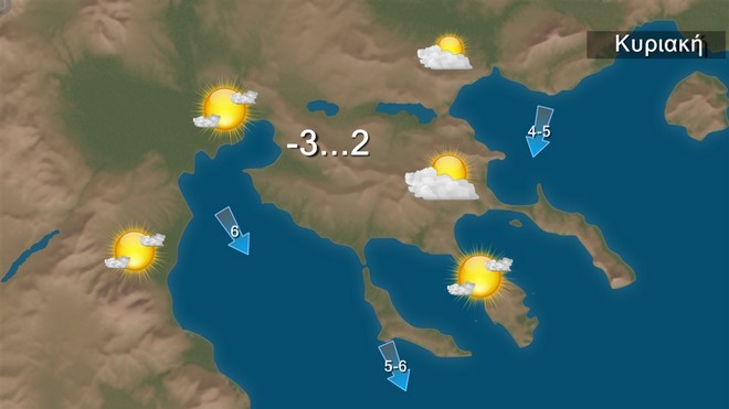 Την Κυριακή προβλέπονται τοπικές χιονοπτώσεις στις Σποράδες, την ανατολική Μακεδονία, τη Θράκη, τη Χαλκιδική, τα νησιά του βορειοανατολικού Αιγαίου, κυρίως την Εύβοια και πρόσκαιρα τις πρωινές ώρες στα ανατολικά τμήματα της ανατολικής Στερεάς. Οι άνεμοι θα πνέουν από βόρειες διευθύνσεις 5 με 7 μποφόρ, με εξασθένηση από τις μεσημβρινές ώρες. Η θερμοκρασία θα σημειώσει μικρή περαιτέρω πτώση και παγετός θα σημειωθεί στα ηπειρωτικά τις πρωινές και βραδινές ώρες, που θα είναι κατά τόπους ισχυρός στα κεντρικά και τα βόρεια ενώ σε περιοχές της Μακεδονίας και της Θράκης θα είναι ολικός. Η θερμοκρασία θα κυμανθεί σε χαμηλά επίπεδα και θα έχει μέγιστη τιμή στα βόρεια τους 3 βαθμούς, στα υπόλοιπα ηπειρωτικά και το Ιόνιο τους 7 με 11 βαθμούς Κελσίου, στις Κυκλάδες και την Κρήτη τους 11 βαθμούς και στο Ανατολικό Αιγαίο και τα Δωδεκάνησα τους 13 βαθμούς Κελσίου.