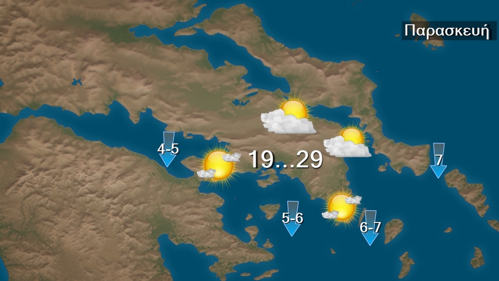 Την Παρασκευή λίγες τοπικές βροχές προβλέπονται στη Θεσσαλία, τις Σποράδες, την Εύβοια, τη Στερεά και την Κρήτη. Οι άνεμοι θα πνέουν από βόρειες διευθύνσεις 4 με 6 και στο Αιγαίο 7 τοπικά 8 μποφόρ. Η θερμοκρασία θα φθάσει στα κεντρικά και βορειοδυτικά ηπειρωτικά τους 25 με 28 βαθμούς και στην υπόλοιπη χώρα τους 29 με 31 βαθμούς Κελσίου.
