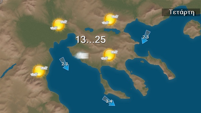Την Τετάρτη προβλέπεται γενικά αίθριος καιρός, με πρόσκαιρες τοπικές νεφώσεις κυρίως στα βορειοανατολικά. Η ορατότητα τις πρωινές και τις βραδινές ώρες θα είναι τοπικά περιορισμένη κυρίως στα δυτικά και τα βόρεια και θα σχηματιστούν κατά τόπους ομίχλες.