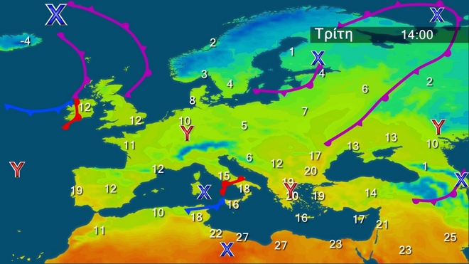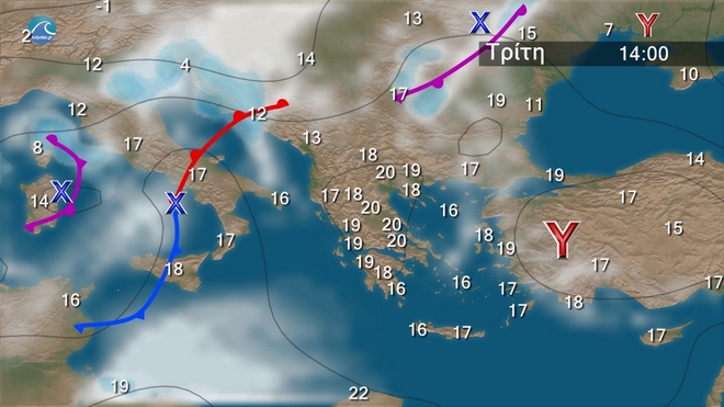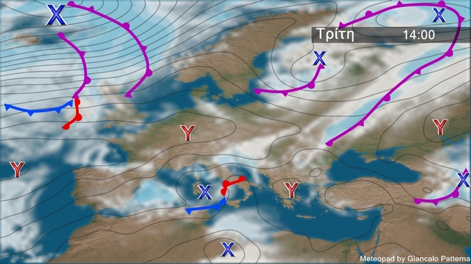 Στην περιοχή μας θα διατηρηθεί το υψηλό πεδίο πιέσεων ενώ αντίθετα η κεντρική Μεσόγειος και η βόρεια Ευρώπη επηρεάζονται από βαρομετρικά χαμηλά.