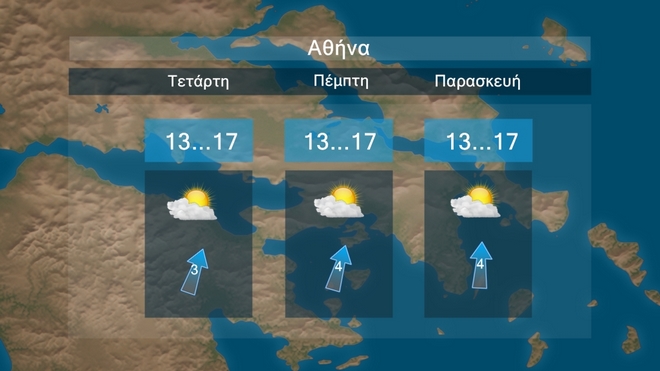 Στα δυτικά, τα βόρεια, τα νησιά του ανατολικού Αιγαίου και τα Δωδεκάνησα νεφώσεις παροδικά αυξημένες με τοπικές βροχές και κυρίως στα βορειοδυτικά σποραδικές καταιγίδες. Στην υπόλοιπη χώρα αραιές νεφώσεις κατά περιόδους πιο πυκνές με πιθανότητα ασθενών τοπικών βροχών. Οι άνεμοι θα πνέουν νότιοι νοτιοδυτικοί 3 με 5 και στα πελάγη τοπικά 6 μποφόρ, με τάση ενίσχυσης από το βράδυ. Η θερμοκρασία δεν θα σημειώσει αξιόλογη μεταβολή.