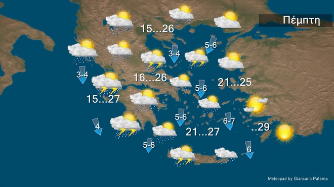 Σήμερα Πέμπτη σε όλη τη χώρα προβλέπονται τοπικές νεφώσεις παροδικά αυξημένες και θα εκδηλωθούν τοπικά ισχυρές βροχές και καταιγίδες στις Σποράδες, την Εύβοια (κυρίως την κεντρική και τη βόρεια), τη Θεσσαλία, την ανατολική Στερεά, την Πελοπόννησο, πρόσκαιρα μέχρι το μεσημέρι στα δυτικά τμήματα της Κρήτης και τις βραδινές ώρες στο βορειοανατολικό Αιγαίο. Οι άνεμοι θα πνέουν, στα δυτικά μεταβλητοί 3 με 4 μποφόρ, στα ανατολικά από βόρειες διευθύνσεις 4 με 6 και στο βόρειο Αιγαίο πρόσκαιρα το πρωί έως 7 μποφόρ. Η θερμοκρασία δεν θα σημειώσει αξιόλογη μεταβολή και θα κυμανθεί σε χαμηλά για την εποχή επίπεδα και στα δυτικά, τα Δωδεκάνησα και τη νότια Κρήτη θα φτάσει μέχρι 29 βαθμούς και στα υπόλοιπα 25 με 26 βαθμούς Κελσίου .