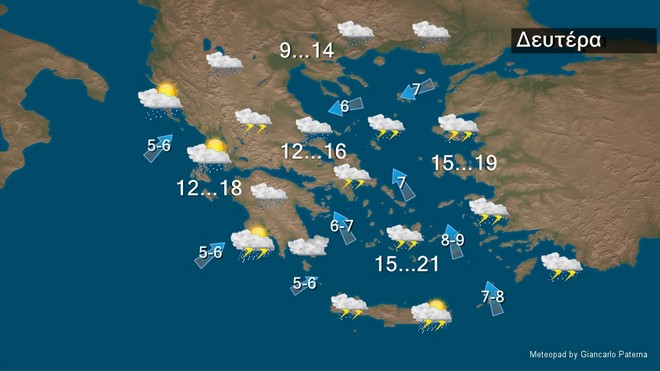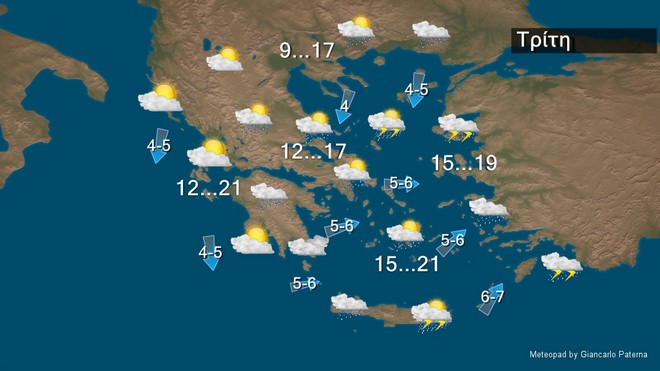 Στα δυτικά νεφώσεις με τοπικές βροχές, μεμονωμένες καταιγίδες κυρίως στα νότια και σταδιακή βελτίωση από το απόγευμα. Στις υπόλοιπες περιοχές νεφώσεις με τοπικές βροχές και καταιγίδες, ισχυρές στα νησιά του ανατολικού Αιγαίου, τα Δωδεκάνησα και βαθμιαία στην Κρήτη και πιθανώς στις Κυκλάδες. Τα φαινόμενα μετά το απόγευμα σταδιακά θα περιοριστούν στα νοτιοανατολικά. Οι άνεμοι στα βόρεια θα πνέουν από διάφορες διευθύνσεις 4 μποφόρ, οι οποίοι θα γίνουν βορειοδυτικοί τοπικά 5 μποφόρ. Στα νότια θα πνέουν δυτικοί νοτιοδυτικοί 4 με 5 και τοπικά έως 6 μποφόρ, που μέχρι το βράδυ θα στραφούν σε δυτικούς βορειοδυτικούς. Στα Δωδεκάνησα πρόσκαιρα τις πρωινές ώρες θα πνέουν νοτιοανατολικοί με την ίδια ένταση. Η θερμοκρασία δεν θα σημειώσει αξιόλογη μεταβολή.
