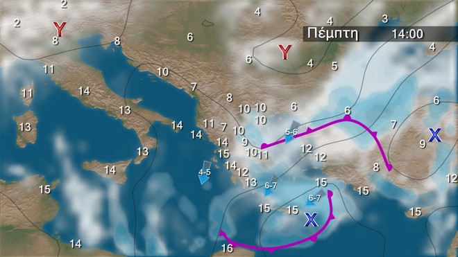Την Πέμπτη στα δυτικά και βόρεια προβλέπονται νεφώσεις κατά περιόδους αυξημένες με τοπικές βροχές στα βόρεια και σποραδικές καταιγίδες στο Ιόνιο. Στις υπόλοιπες περιοχές προβλέπονται βροχές και σποραδικές καταιγίδες, κατά τόπους ισχυρές κατά διαστήματα στα ανατολικά ηπειρωτικά, την Εύβοια, τις βόρειες Σποράδες καθώς και στην ανατολική και νότια νησιωτική χώρα. Χιονοπτώσεις θα σημειωθούν στα ηπειρωτικά ορεινά και στα ορεινά της Κρήτης καθώς και στα ημιορεινά της βόρειας χώρας. Ευνοείται η  μεταφορά σκόνης στα νότια. Οι άνεμοι θα πνέουν βορειοανατολικοί 5 με 7 και στα νοτιοανατολικά νοτιοανατολικοί 4 με 5 μποφόρ αλλά βαθμιαία στα δυτικά οι άνεμοι θα εξασθενήσουν. Η θερμοκρασία θα παρουσιάσει περαιτέρω πτώση στα κεντρικά και βόρεια.