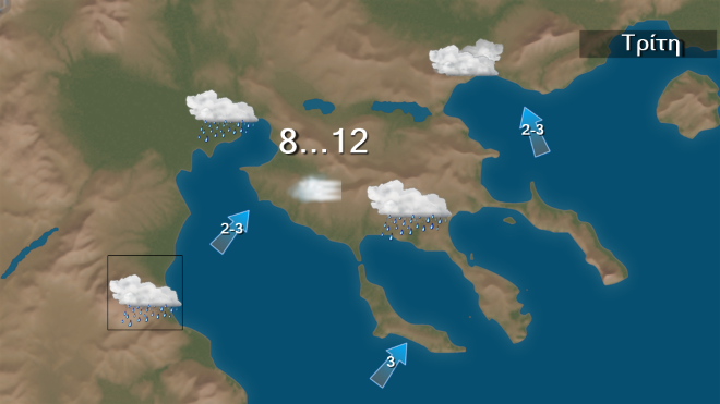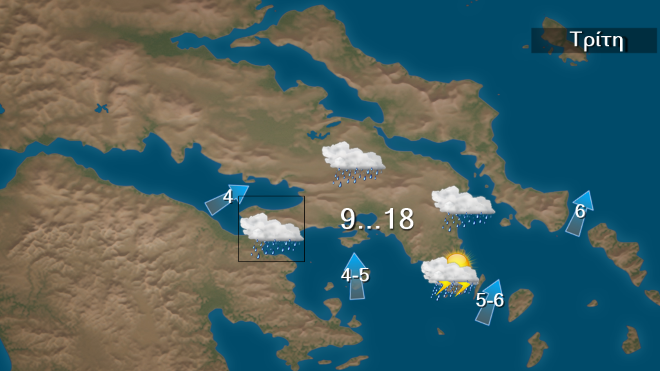 Σήμερα Τρίτη σε όλη τη χώρα προβλέπονται νεφώσεις παροδικά αυξημένες με τοπικές βροχές και σποραδικές καταιγίδες. Τα φαινόμενα θα είναι κατά τόπους ισχυρά στη δυτική και νότια Πελοπόννησο, στα νησιά του βορειοανατολικού Αιγαίου και τη Θράκη και πρόσκαιρα το πρωί στη δυτική Στερεά. Οι άνεμοι θα πνέουν από νότιες διευθύνσεις 4 με 6 και στο Αιγαίο τοπικά έως 7 μποφόρ. Η θερμοκρασία δεν θα παρουσιάσει αξιόλογη μεταβολή και θα φτάσει στα βόρεια τους 13 με 14 βαθμούς και στα υπόλοιπα τους 17 με 19 βαθμούς Κελσίου.