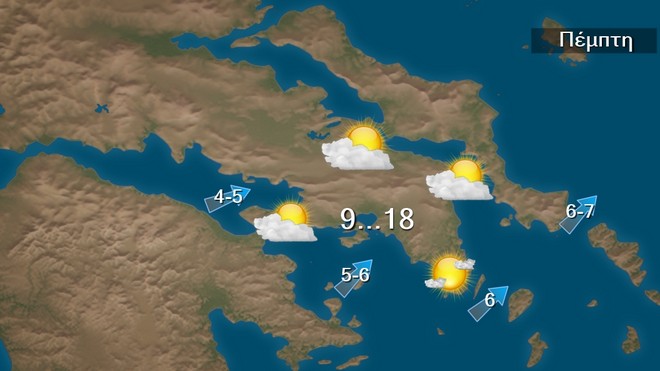 Την Πέμπτη στη δυτική Ελλάδα προβλέπονται τοπικές βροχές και από το μεσημέρι σποραδικές καταιγίδες, αρχικά στο Ιόνιο και την Ήπειρο και βαθμιαία και στις υπόλοιπες περιοχές. Στην υπόλοιπη χώρα λίγες τοπικές νεφώσεις, που βαθμιαία θα αυξηθούν και θα σημειωθούν τοπικές βροχές κυρίως στα κεντρικά και βόρεια ηπειρωτικά και το ανατολικό Αιγαίο. Οι άνεμοι θα πνέουν νότιοι νοτιοδυτικοί με ένταση που θα φτάσει στα πελάγη τα 7 και στο Αιγαίο βαθμιαία τοπικά τα 8 μποφόρ. Η θερμοκρασία θα παρουσιάσει άνοδο και θα φτάσει στα βόρεια τους 16 βαθμούς, στα δυτικά και νότια ηπειρωτικά τους 18 με 19 βαθμούς και στα νησιά του Αιγαίου τους 20 βαθμούς Κελσίου.