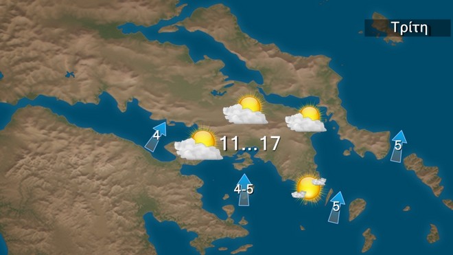 Στην πρόγνωση του καιρού για την Τρίτη στα νησιά του ανατολικού Αιγαίου και τα Δωδεκάνησα προβλέπονται βροχές και σποραδικές καταιγίδες, που θα είναι κατά τόπους ισχυρές. Στα δυτικά θα εκδηλωθούν σποραδικές βροχές και καταιγίδες. Στις υπόλοιπες περιοχές θα υπάρχουν αραιές νεφώσεις κατά τόπους πιο πυκνές με τοπικές βροχές μικρής διάρκειας. Οι άνεμοι θα πνέουν από νότιες διευθύνσεις ασθενείς μέχρι μέτριοι και στα νοτιοανατολικά 6 με 7 μποφόρ με τάση εξασθένησης. Η θερμοκρασία δεν θα σημειώσει αξιόλογη μεταβολή και θα έχει μέγιστη τιμή στα βόρεια τους 16 βαθμούς, στα υπόλοιπα ηπειρωτικά και το Ιόνιο τους 16 με 17 βαθμούς Κελσίου, στις Κυκλάδες και την Κρήτη τους 18 βαθμούς και στο Ανατολικό Αιγαίο και τα Δωδεκάνησα τους 19 βαθμούς Κελσίου.