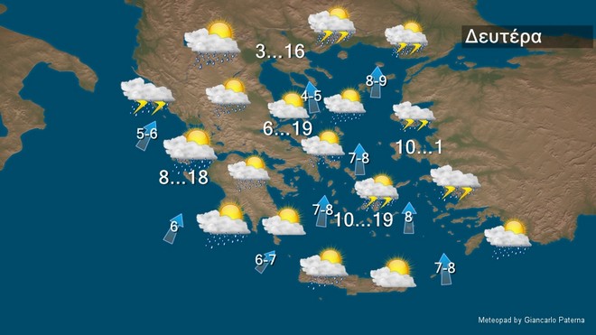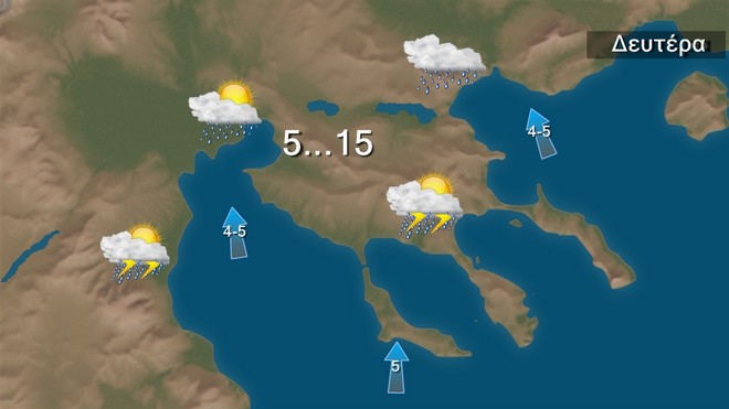 Τη Δευτέρα στα δυτικά, τα βορειοανατολικά και την ανατολική νησιωτική χώρα, προβλέπονται βροχές και σποραδικές καταιγίδες. Τα φαινόμενα στα νησιά του βορείου και ανατολικού Αιγαίου, μέχρι το απόγευμα στην ανατολική Μακεδονία και τη Θράκη και στα δυτικά τις πρώτες πρωινές ώρες, θα είναι κατά τόπους ισχυρά. Στην υπόλοιπη χώρα προβλέπονται αυξημένες νεφώσεις με τοπικές βροχές, πρόσκαιρες καταιγίδες και βαθμιαία βελτίωση. Οι άνεμοι θα πνέουν από νότιες διευθύνσεις, στο Αιγαίο 7 με 8 και τοπικά 9 μποφόρ, με μικρή εξασθένηση από το απόγευμα. Η θερμοκρασία θα σημειώσει μικρή πτώση στα δυτικά και θα έχει μέγιστη τιμή στα βόρεια τους 16 βαθμούς, στα υπόλοιπα ηπειρωτικά και το Ιόνιο τους 18 με 19 βαθμούς Κελσίου, στις Κυκλάδες και την Κρήτη τους 19 βαθμούς και στο Ανατολικό Αιγαίο και τα Δωδεκάνησα τους 18 βαθμούς Κελσίου.