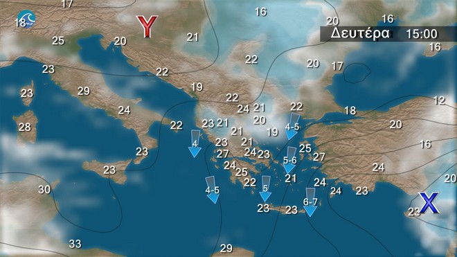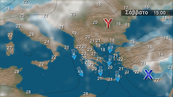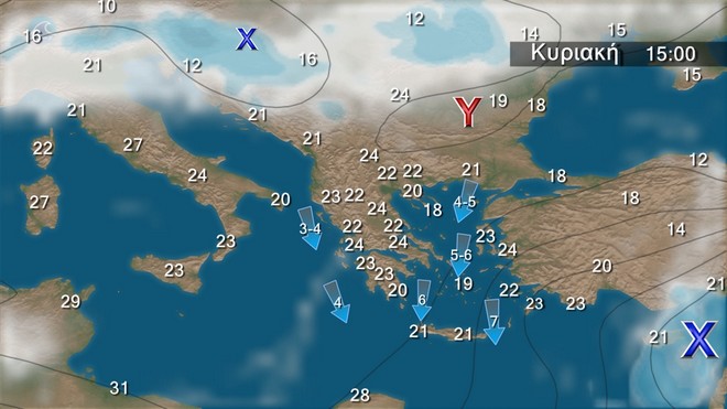 Στα βόρεια λίγες νεφώσεις που βαθμιαία θα αυξηθούν και θα εκδηλωθούν τοπικές βροχές και σποραδικές καταιγίδες, κυρίως τις μεσημβρινές και απογευματινές ώρες. Στις υπόλοιπες περιοχές γενικά αίθριος καιρός και μόνο στα ηπειρωτικά το μεσημέρι και το απόγευμα θα αναπτυχθούν τοπικές νεφώσεις και θα εκδηλωθούν πρόσκαιροι όμβροι.Οι άνεμοι θα πνέουν βόρειοι βορειοδυτικοί στα δυτικά, κεντρικά και βόρεια 3 με 5 μποφόρ, στα πελάγη 6 και στο νοτιοανατολικό Αιγαίο τοπικά 7 μποφόρ.Η θερμοκρασία δε θα σημειώσει αξιόλογη μεταβολή και θα κυμανθεί σε κανονικά για την εποχή επίπεδα.