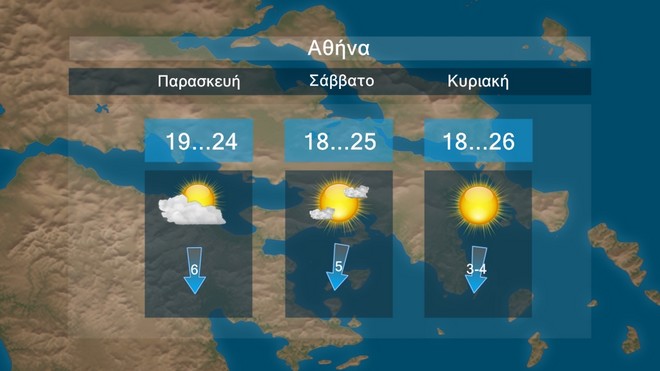 Λίγες νεφώσεις τοπικά αυξημένες, με πρόσκαιρες τοπικές βροχές τις πρωινές ώρες στην Κρήτη και τα βορειοανατολικά και μέχρι το απόγευμα στην Πελοπόννησο πιθανώς μεμονωμένες καταιγίδες. Οι άνεμοι θα πνέουν από βόρειες διευθύνσεις 3 με 4 και στα πελάγη 5 μποφόρ, στο Αιγαίο 6 με 7 και πιθανώς στα νοτιοανατολικά 8 μποφόρ. Η θερμοκρασία θα σημειώσει μικρή άνοδο στο Ιόνιο και τα ηπειρωτικά.