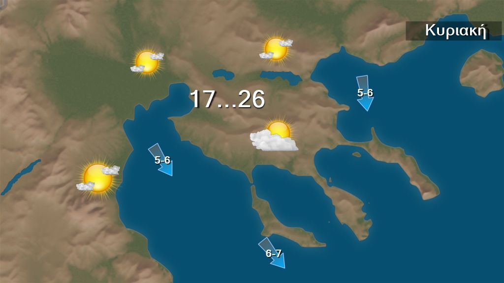 Σήμερα Κυριακή αρχικά στα δυτικά τα κεντρικά και τα βόρεια προβλέπονται τοπικές βροχές και σποραδικές καταιγίδες που πολύ γρήγορα θα εξασθενήσουν και θα περιοριστούν στα βορειοανατολικά. Στις υπόλοιπες περιοχές θα υπάρχουν λίγες παροδικές νεφώσεις. Οι άνεμοι θα πνέουν στα ανατολικά από νότιες διευθύνσεις 5 με 7 μποφόρ, που γρήγορα θα στραφούν σε δυτικούς βορειοδυτικούς με την ίδια ένταση. Στα δυτικά βορειοδυτικοί 6 με 7 και στο Ιόνιο πιθανώς πρόσκαιρα έως 8 μποφόρ. Η θερμοκρασία θα σημειώσει πτώση κυρίως στα δυτικά και τα βόρεια. Στα βόρεια θα φτάσει τους 26 με 29 βαθμούς, στα υπόλοιπα ηπειρωτικά τους 29 με 30 βαθμούς και στην Κρήτη τοπικά τους 33 με 34 βαθμούς Κελσίου.