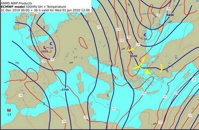 Η διαταραχή που έχουμε σημειώσει στον παραπάνω χάρτη συνοδεύεται και από ψυχρές μάζες όχι όμως όπως ήταν αυτές της προηγούμενης διαταραχής . Τούτο είναι εμφανές στους δύο χάρτες των 500 hPa και των 850 hPa που ακολουθούν.