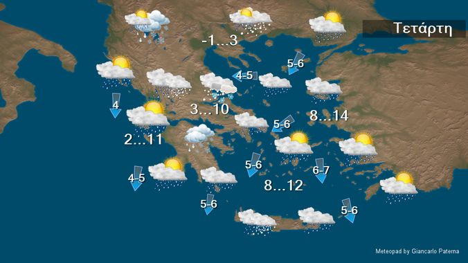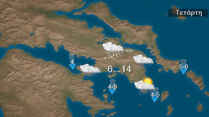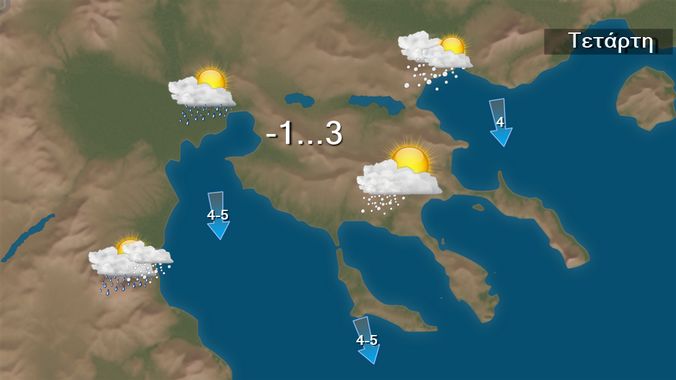 Σήμερα Τετάρτη προβλέπεται κακοκαιρία με τοπικές βροχές και στα θαλάσσια και παραθαλάσσια σποραδικές καταιγίδες. Χιονοπτώσεις θα σημειωθούν από τις πρώτες ώρες στα ορεινά – ημιορεινά της ηπειρωτικής Ελλάδας, σε πεδινές περιοχές Ηπείρου, της Μακεδονίας και της Θράκης και βαθμιαία σε περιοχές της Θεσσαλίας και της κεντρικής Στερεάς με χαμηλό υψόμετρο καθώς και στα ορεινά της Κρήτης. Οι άνεμοι θα πνέουν από βόρειες διευθύνσεις 4 με 6 και στο Αιγαίο 6 με 7 μποφόρ.