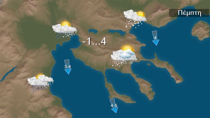 Οι άνεμοι θα πνέουν από βόρειες διευθύνσεις και στο Αιγαίο θα φτάνουν τα 7 με 8 μποφόρ. Η θερμοκρασία θα κυμανθεί σε πολύ χαμηλά για την εποχή επίπεδα και μστα βόρεια και κεντρικά δεν θα ξεπεράσει τους 4 με 6 βαθμούς , στα δυτικά τους 9 και στο Αιγαίο τους 10 βαθμούς Κελσίου . Παγετός θα σημειωθεί στα ηπειρωτικά, ο οποίος τις πρωινές και βραδινές ώρες στα βορειοδυτικά θα είναι κατά τόπους ισχυρός.