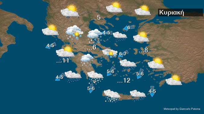 Νεφώσεις παροδικά αυξημένες στα ανατολικά και τα νότια, όπου θα σημειωθούν τοπικές βροχές ή χιονόνερο, χιόνια στα ορεινά και ημιορεινά, καθώς και σε περιοχές με χαμηλό υψόμετρο στην ανατολική ηπειρωτική χώρα, την Εύβοια , τις Σποράδες, τα νησιά του βορείου και ανατολικού Αιγαίου, τις Κυκλάδες και την Κρήτη. Οι άνεμοι θα πνέουν στα δυτικά απο ανατολικές διευθύνσεις 3 με 4 μποφόρ και στα ανατολικά από βόρειες διευθύνσεις 4 με 6 και στο Αιγαίο τοπικά 7 μποφόρ, με βαθμιαία εξασθένηση.