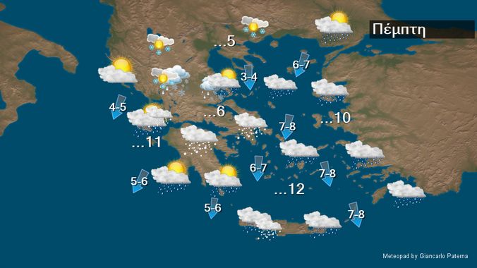 Στο βίντεο που ακολουθεί μπορούμε να παρατηρήσουμε τον καιρό που θα επικρατήσει μέχρι την Κυριακή Η θερμοκρασία θα βρίσκεται κατά 6-8 °C κάτω από τα κανονικά επίπεδα. Χιονοπτώσεις θα σημειωθούν όχι μόνο στα ορεινά ημιορεινά , αλλά και σε περιοχές με χαμηλότερο υψόμετρο.