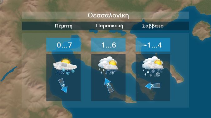 Στη Θεσσαλονίκη προβλέπονται παροδικές νεφώσεις με χιονόνερο ή χιόνια όχι όμως πολλά Η θερμοκρασία θα έχει μέγιστες τιμές περί τους 4 με 7 βαθμούς Κελσίου.