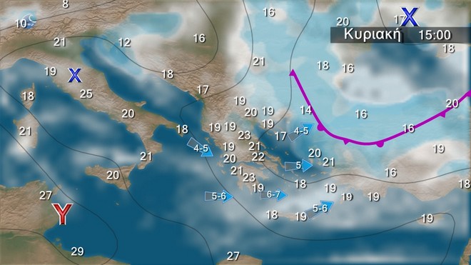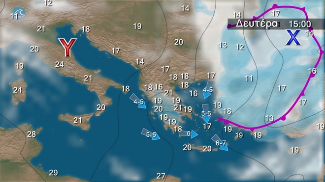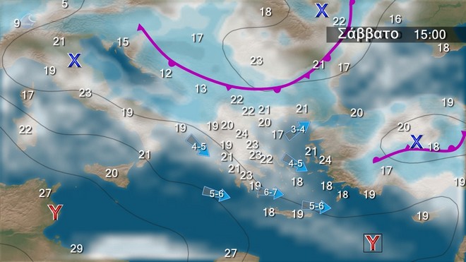 Στα βορειοανατολικά νεφώσεις παροδικά αυξημένες με τοπικές βροχές και μεμονωμένες καταιγίδες. Στην υπόλοιπη χώρα λίγες νεφώσεις που βαθμιαία στα ηπειρωτικά και τις Σποράδες θα αυξηθούν και θα σημειωθούν τοπικές βροχές και από τις απογευματινές ώρες στα βορειότερα σποραδικές καταιγίδες. Οι άνεμοι θα πνέουν στα δυτικά δυτικοί βορειοδυτικοί 4 με 5 και από το απόγευμα στο Ιόνιο τοπικά 6 μποφόρ, στα ανατολικά δυτικοί νοτιοδυτικοί 4 με 5 και στα νότια τοπικά 6 μποφόρ. Η θερμοκρασία θα σημειώσει μικρή πτώση στα δυτικά και τα βόρεια.