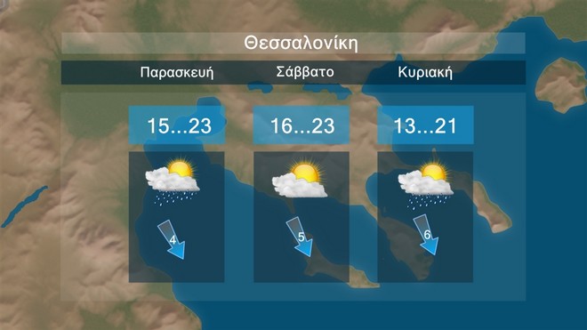 Στη Θεσσαλονίκη ο καιρός θα κυλήσει με τοπικές νεφώσεις παροδικά αυξημένες και τοπικές μπόρες την Παρασκευή και την Κυριακή Η θερμοκρασία θα έχει μέγιστη τιμή τους 23 με 21 βαθμούς Κελσίου