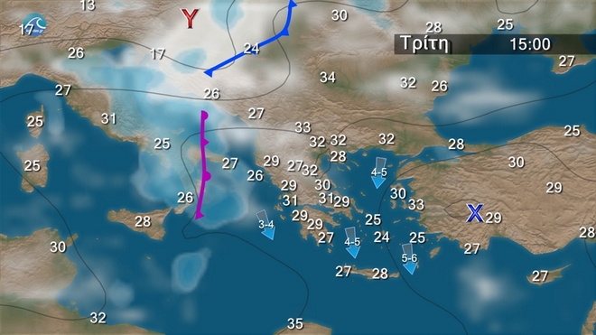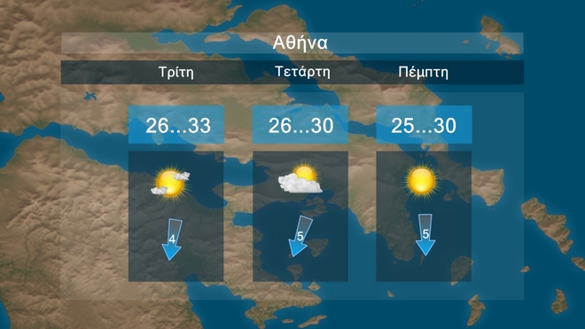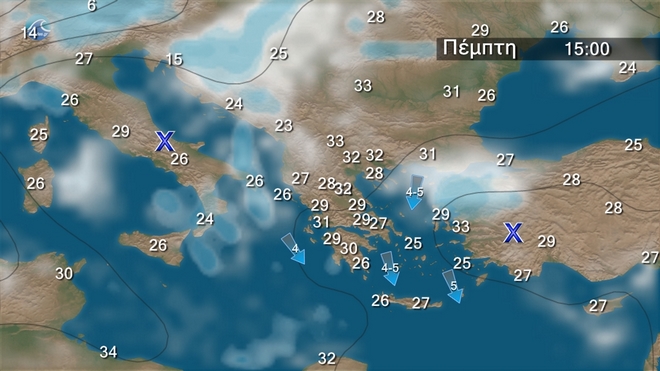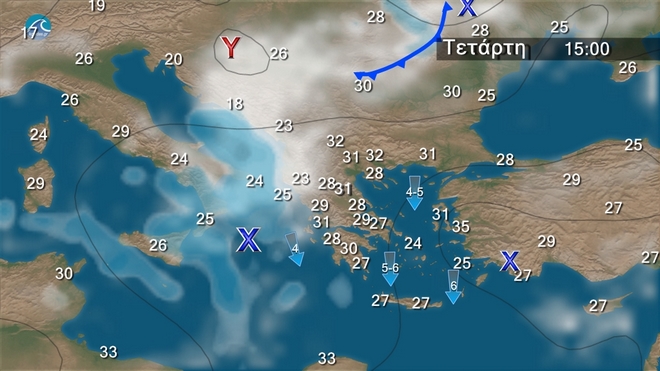 Στα δυτικά λίγες νεφώσεις παροδικά αυξημένες και τις μεσημβρινές και απογευματινές ώρες θα σημειωθούν σποραδικοί όμβροι και πιθανώς μεμονωμένες καταιγίδες στα ορεινά των ηπειρωτικών περιοχών. Στην υπόλοιπη χώρα γενικά αίθριος με τοπικές νεφώσεις στα ηπειρωτικά κυρίως τις μεσημβρινές και απογευματινές ώρες. Οι άνεμοι θα πνέουν στα δυτικά βορειοδυτικοί 3 με 4 και στα ανατολικά από βόρειες διευθύνσεις 4 με 6 μποφόρ. Η θερμοκρασία δεν θα σημειώσει αξιόλογη μεταβολή.