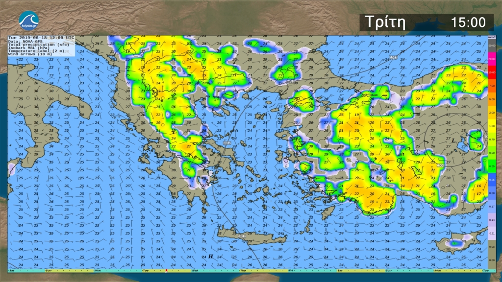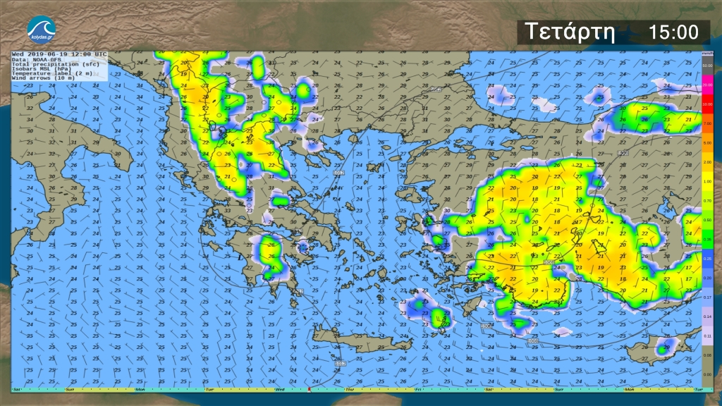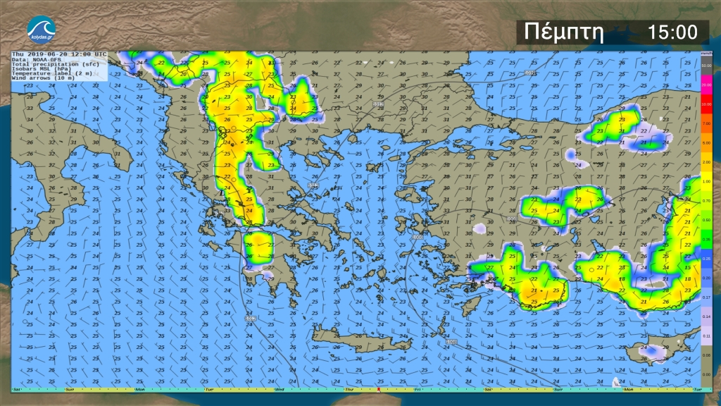 Γενικά αίθριος καιρός, όμως στα ηπειρωτικά τις μεσημβρινές και απογευματινές ώρες θα αναπτυχθούν νεφώσεις και θα εκδηλωθούν τοπικοί όμβροι και κυρίως στα ορεινά μεμονωμένες καταιγίδες. Οι άνεμοι θα είναι βόρειοι βορειοδυτικοί 3 με 5 και στα νοτιοανατολικά τμήματα του Αιγαίου τοπικά 6 μποφόρ. Η θερμοκρασία δεν θα σημειώσει αξιόλογη μεταβολή.