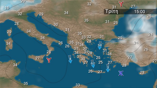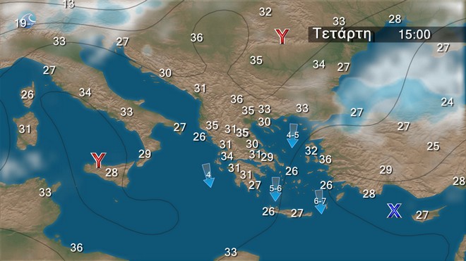 Αίθριος καιρός. Οι άνεμοι θα πνέουν από βόρειες διευθύνσεις στα δυτικά 3 με 4, στα ανατολικά 5 με 6 και στο Αιγαίο κατά τη διάρκεια της ημέρας τοπικά 7 μποφόρ. Η θερμοκρασία θα σημειώσει μικρή περαιτέρω άνοδο κυρίως την Πέμπτη.