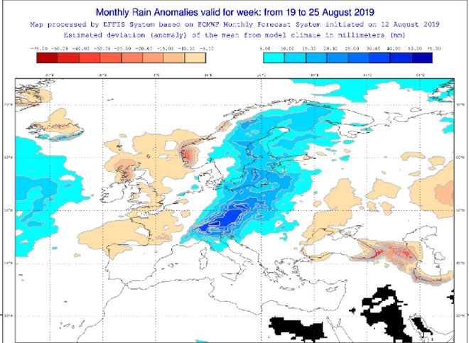 Χωρίς φαινόμενα θα κυλήσει όλη η ερχόμενη εβδομάδα στη χώρα μας όπως διακρίνεται στον παραπάνω χάρτη που μας δείχνει την εβδομαδιαία τάση του καιρού με τις αποκλίσεις του υετού από τις μέσες τιμές. Αντίθετα η Κεντρική και μεγάλο μέρος της Βόρειας Ευρώπης θα έχουν βροχοπτώσεις πάνω από τα κανονικά επίπεδα