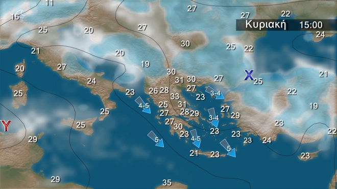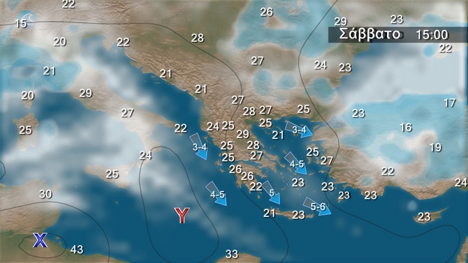 Γενικά αίθριος καιρός, με παροδικές νεφώσεις στα βορειοανατολικά, όπου τις μεσημβρινές και απογευματινές ώρες θα εκδηλωθούν τοπικοί όμβροι και πιθανώς μεμονωμένες καταιγίδες, κυρίως στα ορεινά. Οι άνεμοι δυτικοί βορειοδυτικοί 3 με 5 και στα νότια τοπικά 6 μποφόρ, βαθμιαία στα ανατολικά θα στραφούν σε νοτιοδυτικούς 3 με 5 μποφόρ. Η θερμοκρασία θα σημειώσει άνοδο.