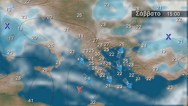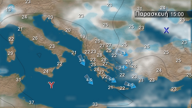 Στα βορειοανατολικά λίγες νεφώσεις που τις μεσημβρινές και απογευματινές ώρες θα αυξηθούν και θα εκδηλωθούν τοπικές βροχές και μεμονωμένες καταιγίδες κυρίως στα ηπειρωτικά. Στην υπόλοιπη χώρα γενικά αίθριος καιρός, με πρόσκαιρες νεφώσεις τις μεσημβρινές και απογευματινές ώρες στα ηπειρωτικά, οπότε θα εκδηλωθούν τοπικοί όμβροι και στα δυτικά και βόρεια μεμονωμένες καταιγίδες. Οι άνεμοι θα πνέουν δυτικοί βορειοδυτικοί 3 με 5 και στα δυτικά και νότια πρόσκαιρα τοπικά 6 μποφόρ. Η θερμοκρασία δεν θα σημειώσει αξιόλογη μεταβολή.