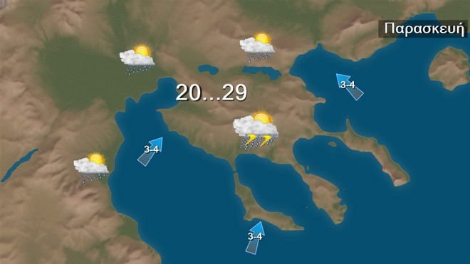 Την Παρασκευή προβλέπεται γενικά αίθριος καιρός. Στα ηπειρωτικά τις μεσημβρινές και απογευματινές ώρες θα εκδηλωθούν τοπικοί όμβροι και κυρίως στα βόρεια μεμονωμένες καταιγίδες. Το βράδυ τα φαινόμενα στη Μακεδονία θα ενταθούν. Οι άνεμοι θα πνέουν βόρειοι βορειοδυτικοί 3 με 5 και στο Αιγαίο 6 τοπικά 7 μποφόρ. Η θερμοκρασία θα σημειώσει μικρή άνοδο και θα φτάσει στα ηπειρωτικά κατά τόπους τους 31 με 33 βαθμούς, και στα νησιά τους 28 με 31 βαθμούς Κελσίου.